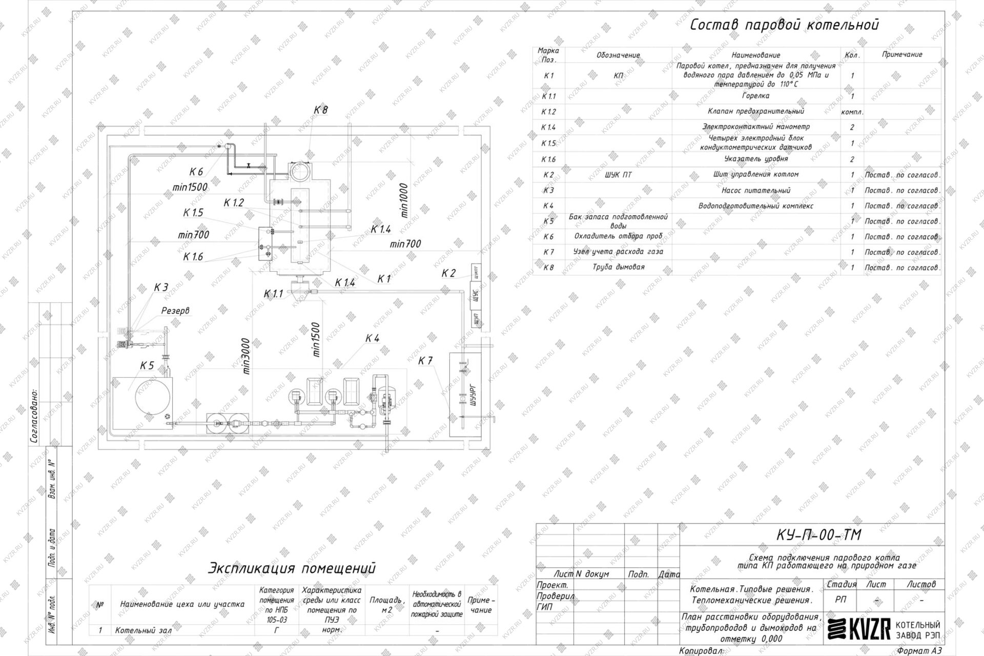 Монтаж парового котла 0.3 т пара -115 °С -0,07 МПа газового в котельной должен производиться в соответствии с проектом и с учетом требований Свода правил СП 89.13330. 2016 «Котельные установки» и «Правил устройства и безопасной эксплуатации паровых котлов с давлением пара не более 0,07 МПа (0,7 кгс/см2), водогрейных котлов и водоподогревателей с температурой нагрева воды не выше 388 К (115 С)». Правильный монтаж котла – залог его надежной и долгой работы.