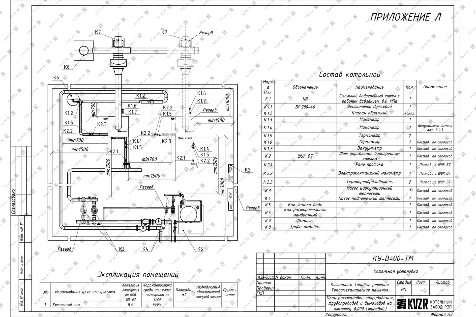К вспомогательному оборудованию при подключении промышленного водогрейного котла КВр относят - щит управления котлом, насос циркуляционный, насос подпиточной воды, бак запаса воды, расширительный мембранный бак, дымовую трубу, систему газоходов и дымосос, золоуловитель (по желанию).