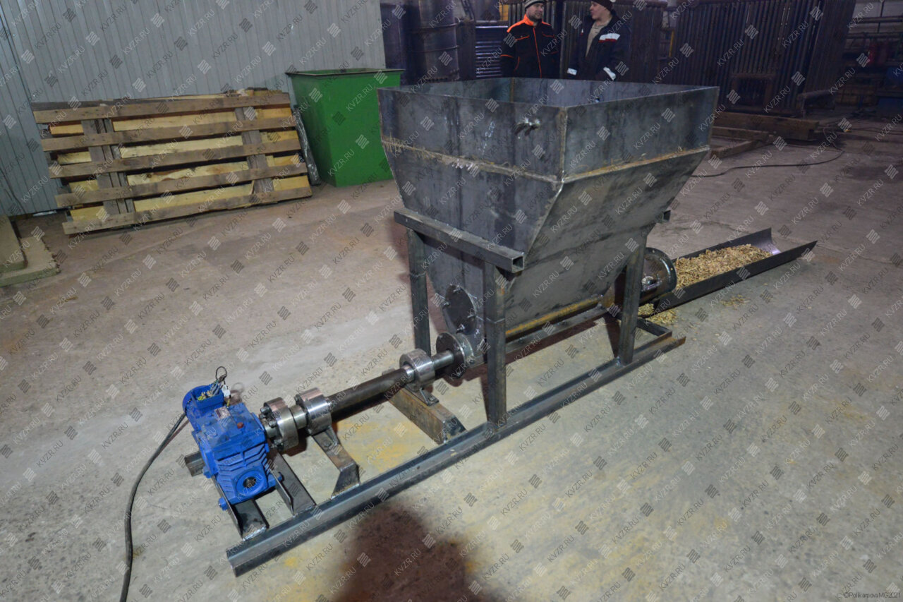 Из бункера топливо подается шнековым питателем. Приводом питателя служит мотор редуктор. Для того, чтобы в шнековом питателе не возникло воспламенение топлива в конструкции предусмотрено воздушное охлаждение выходного узла.