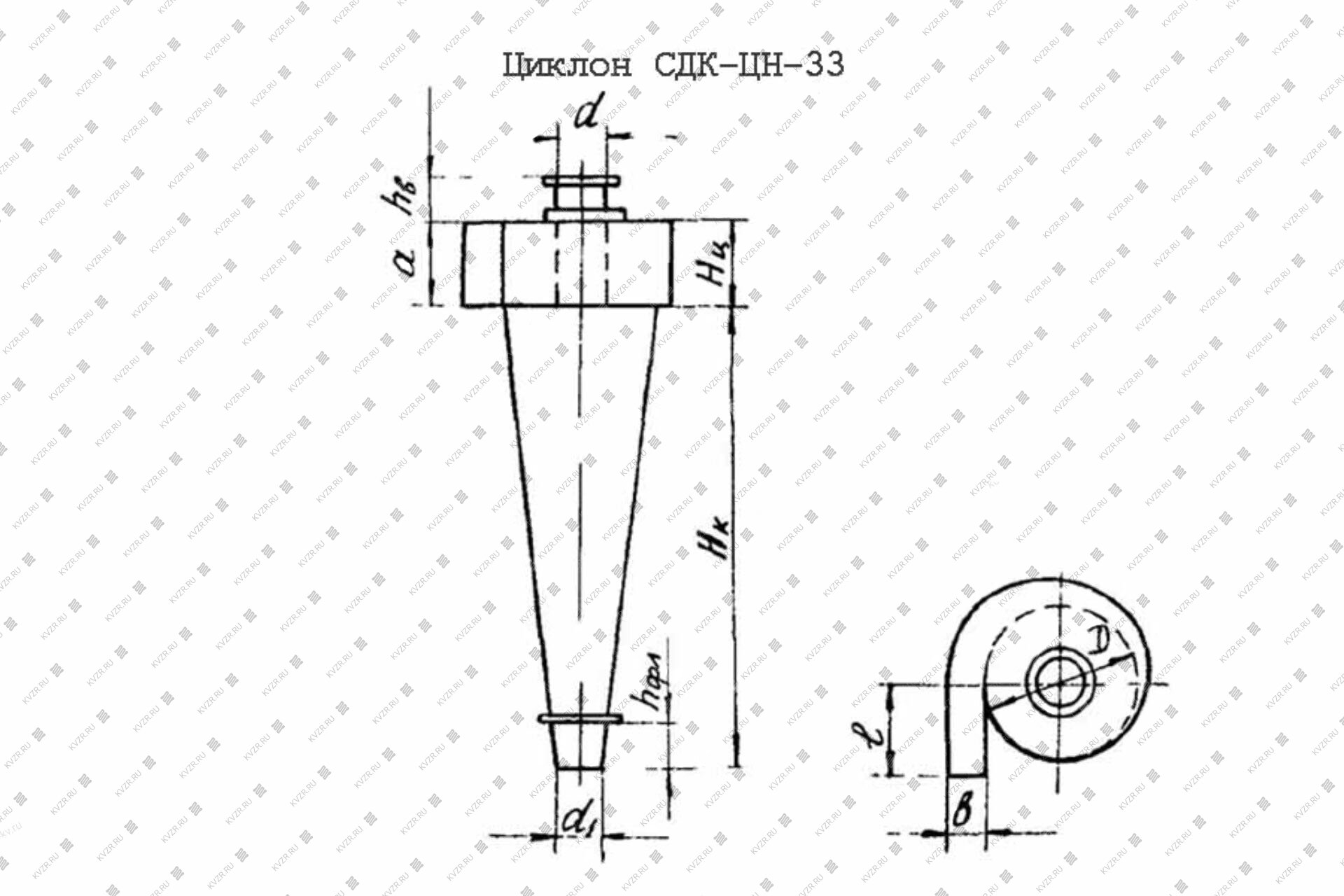 Циклон для пыли СДК ЦН 33 800 конический, в верхней части которого находится небольшая цилиндрическая вставка с входным патрубком спиралевидной формы для направления входящего запыленного потока. В середине корпуса располагается вертикальная стальная труба для удаления очищенного воздуха. Нижняя коническая часть крепится к бункеру для сбора пыли, который снабжен шиберным или шлюзовым затвором с ручным или электрическим приводом. Конические агрегаты обеспечивают наибольшую эффективность пылеулавливания.