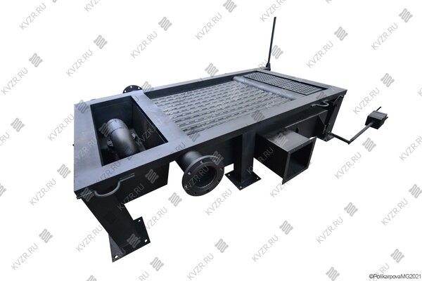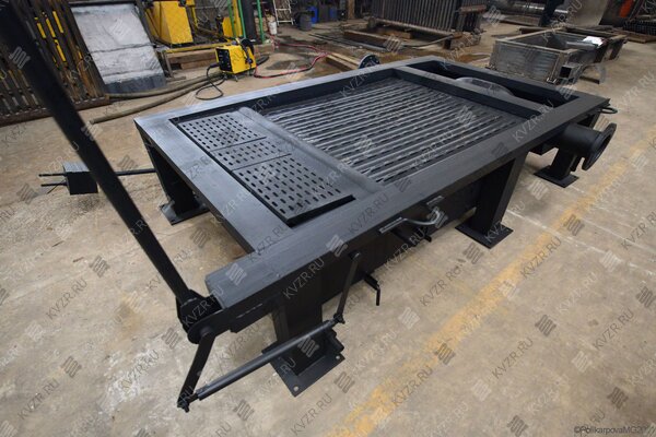 Модель с топкой ОУР. Топка ОУР выполняется из труб по которым движет теплоноситель и межтрубных металлических полос с отверстиями. Теплоноситель - вода, остужает конструкцию изнутри, предотвращая перегрев и програр колосников. Отверстия покрывают всю поверхность колосников для равномерной подачи воздуха в топливный слой. Небольшой размер отверстий не дает провалиться недогоревшему топливу в зольник. Топливо остается в топке до полного выгорания.